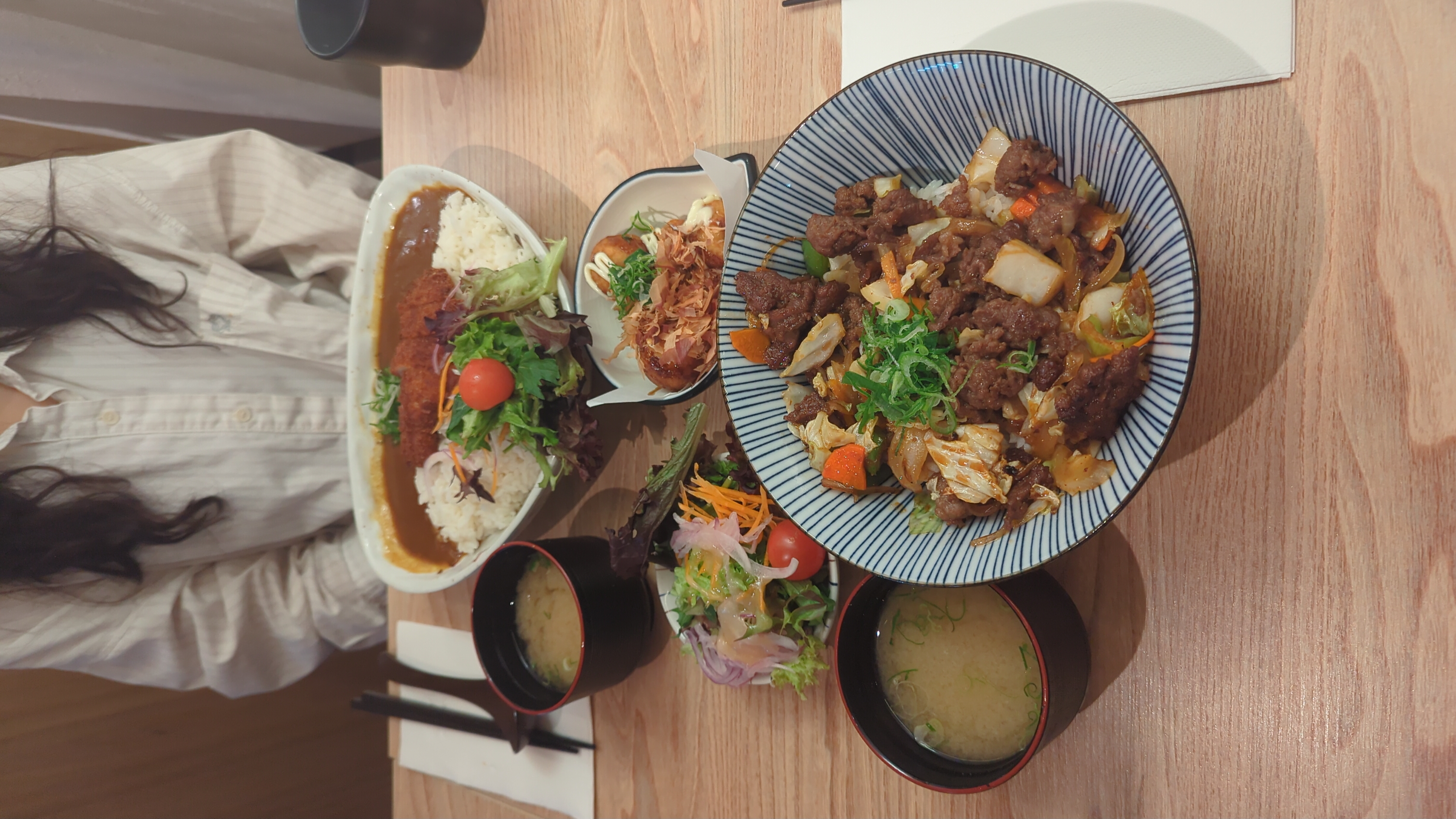 오늘 저녁 퇴근하고 일본 식당에서 먹었다. 밥이랑 고기 주문했다. 야끼니꾸돈이라고 했다. 우리 돈까스카레도 주문했다. 와, 진짜 찐 일본 음식! 정말 맛있다.
